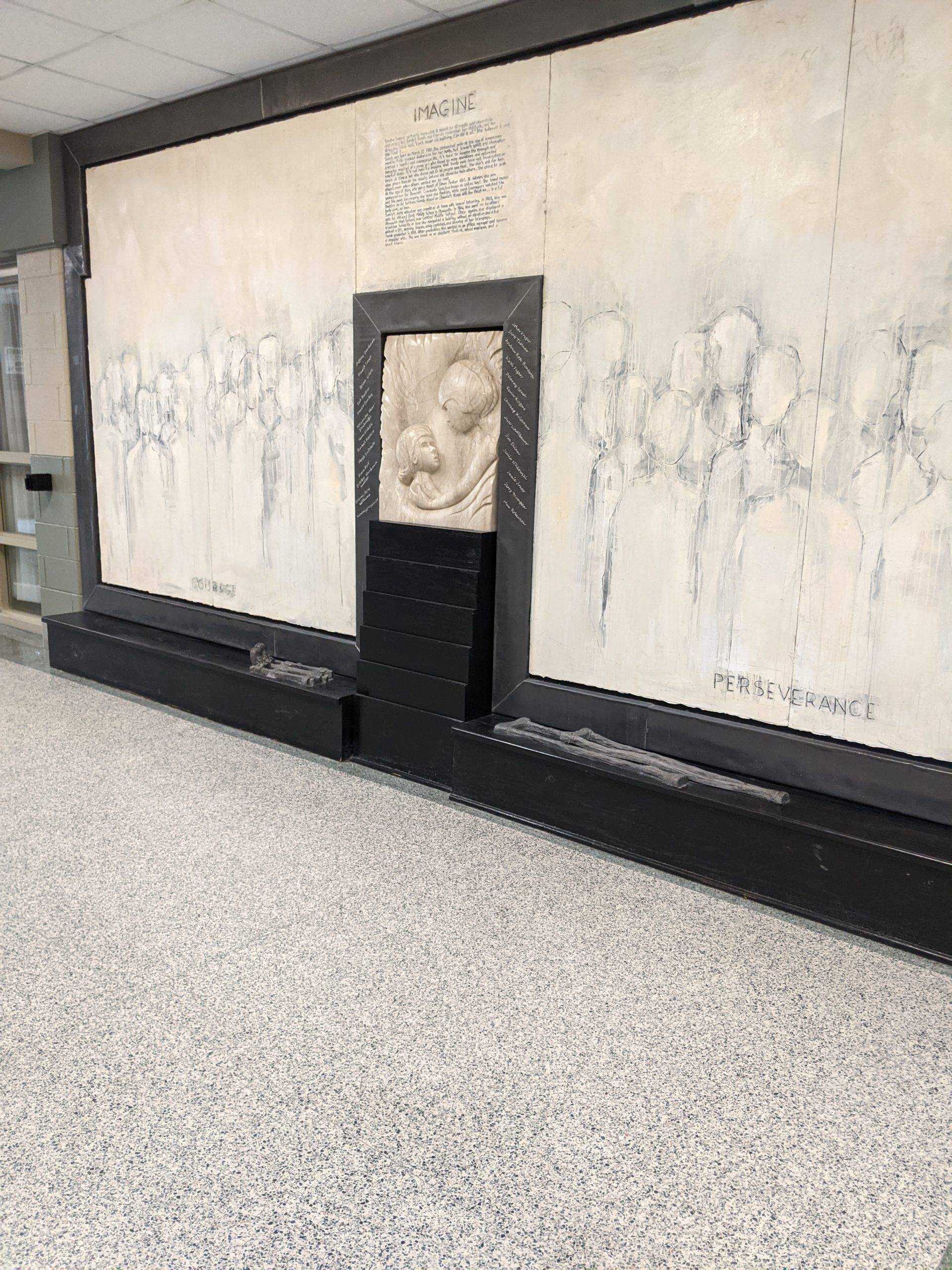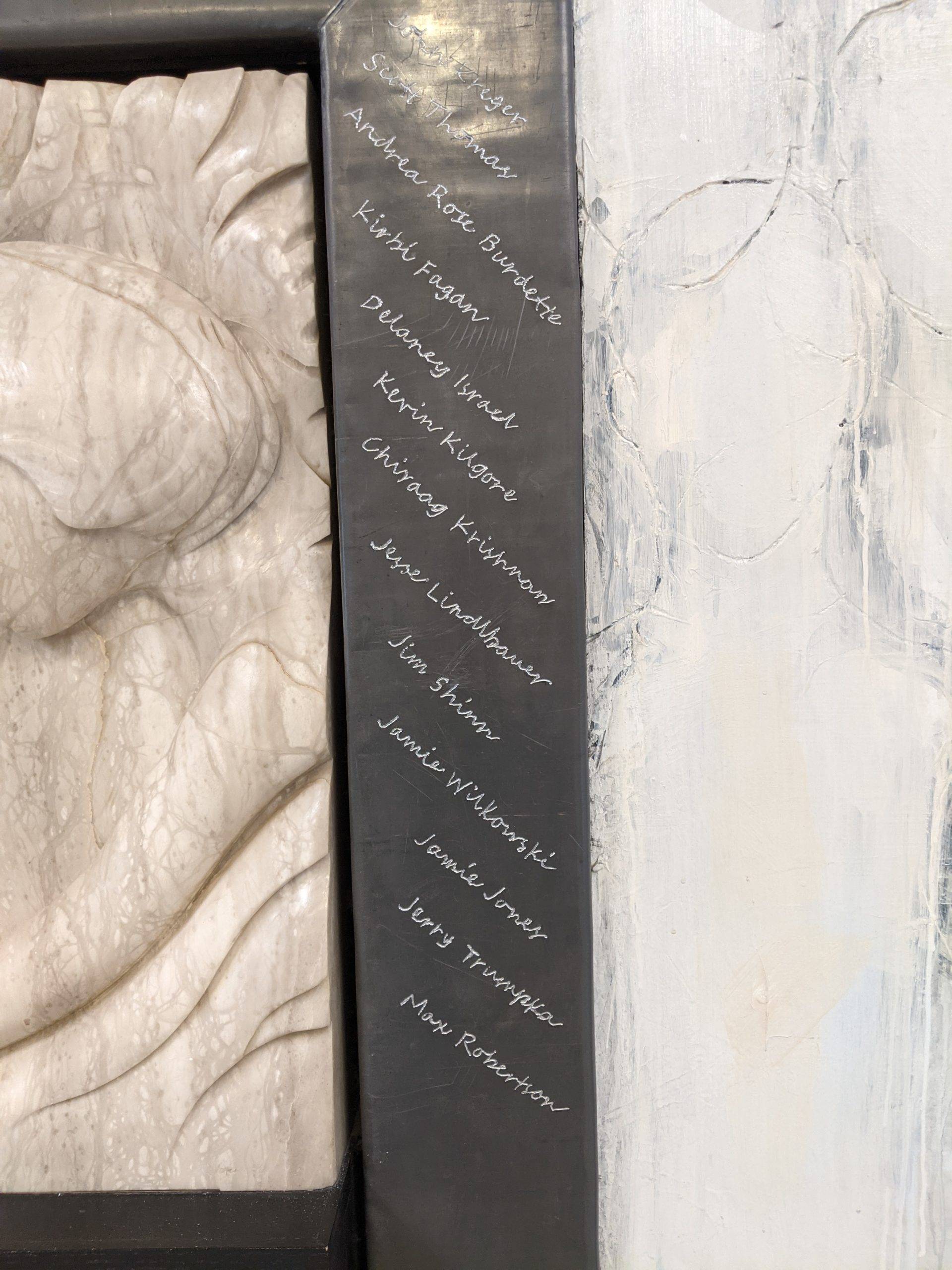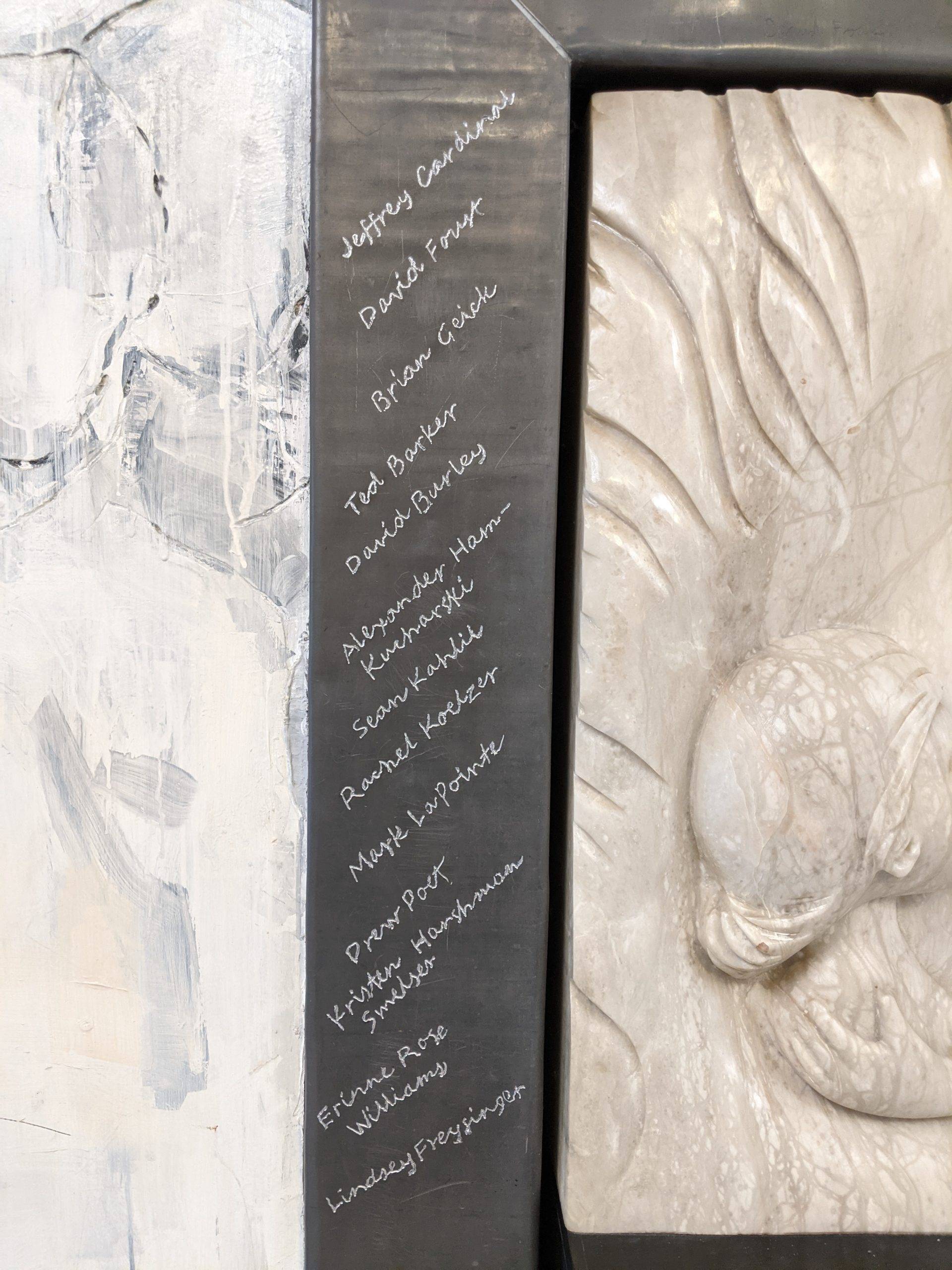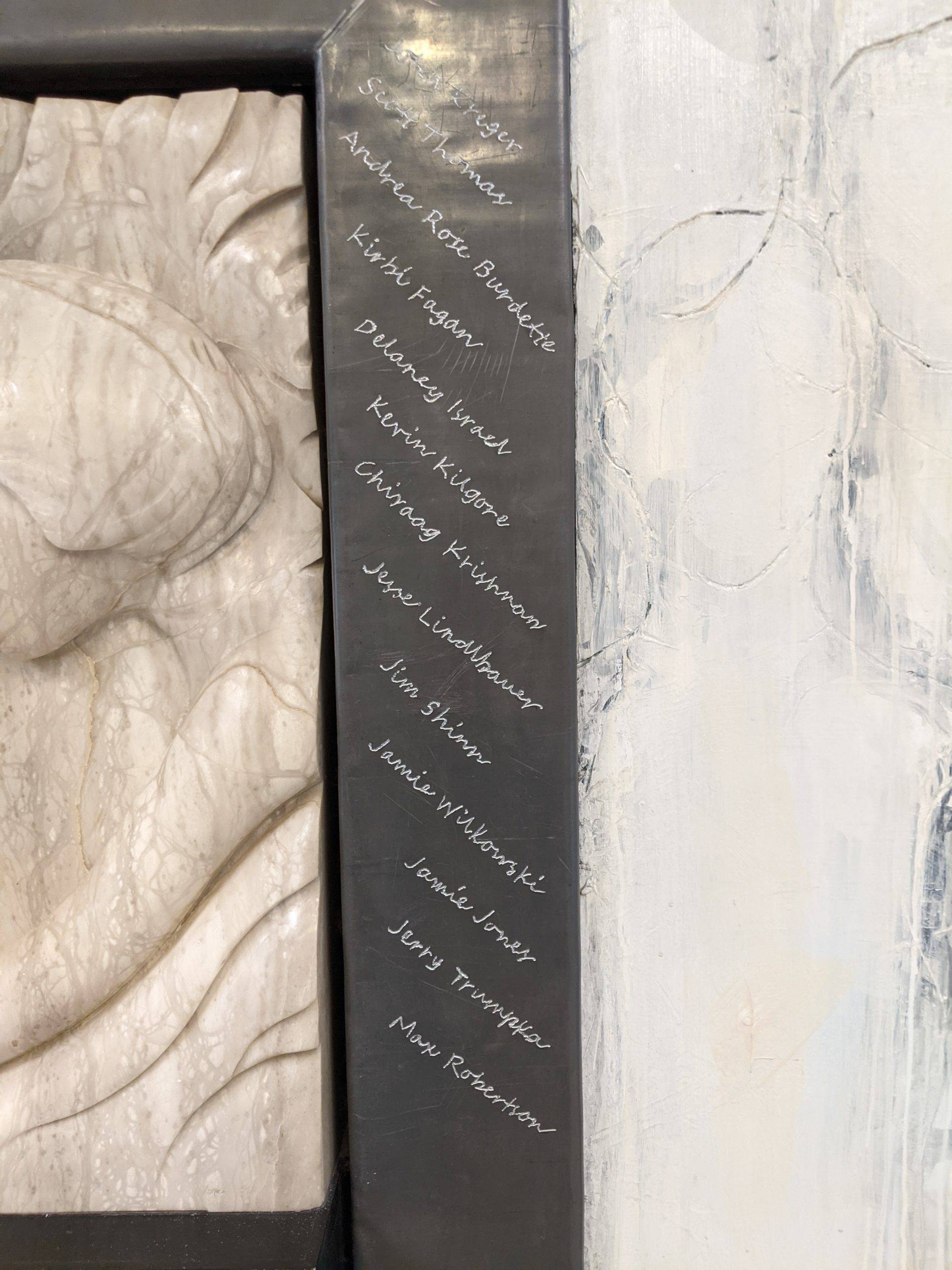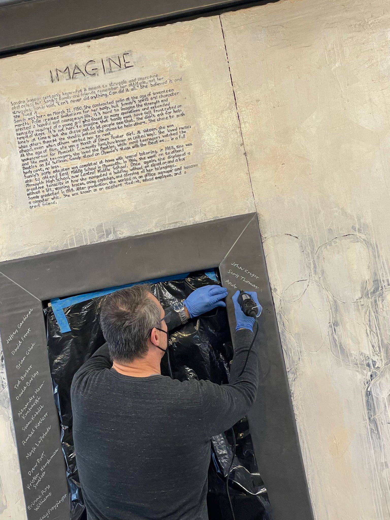 “Here I am this past Saturday engraving 26 names into an installation I designed and completed 23 years ago. The twenty six individuals are past and present students that succeeded in their education while facing some form of adversity. The Sandra Sagear Wall was installed in the new Plymouth High School before its opening in 2001. More photos to follow, but here is my statement about the installation: The image that moved me so regarding Sandra Sagear’s life was picturing her as a small child strapped with leg braces and crutches. I imagined her constant struggle. Struggles that any healthy person would avoid or take for granted. Being a parent, I imagined the hardship her family must have endured.” (Dennis Jones)