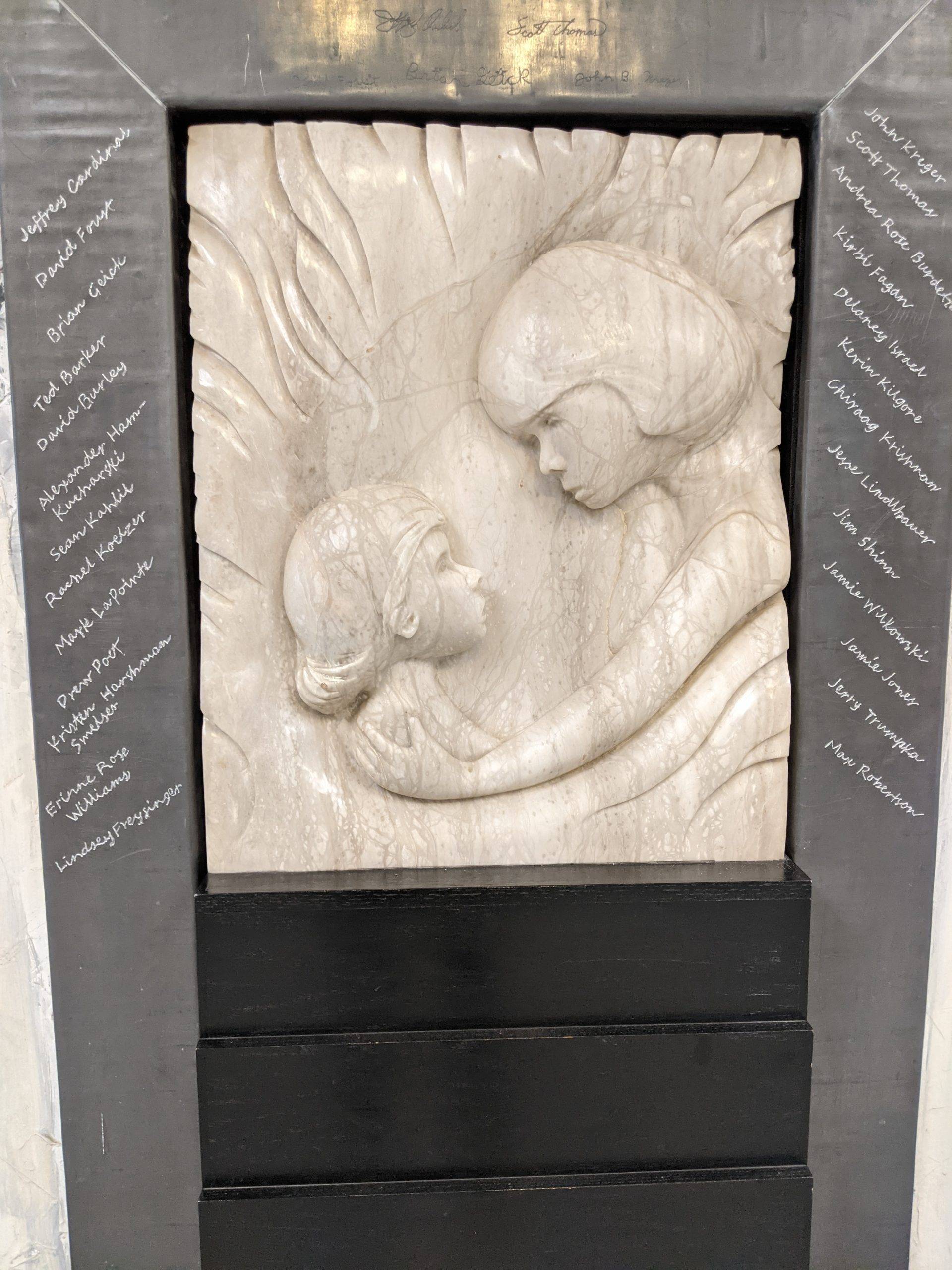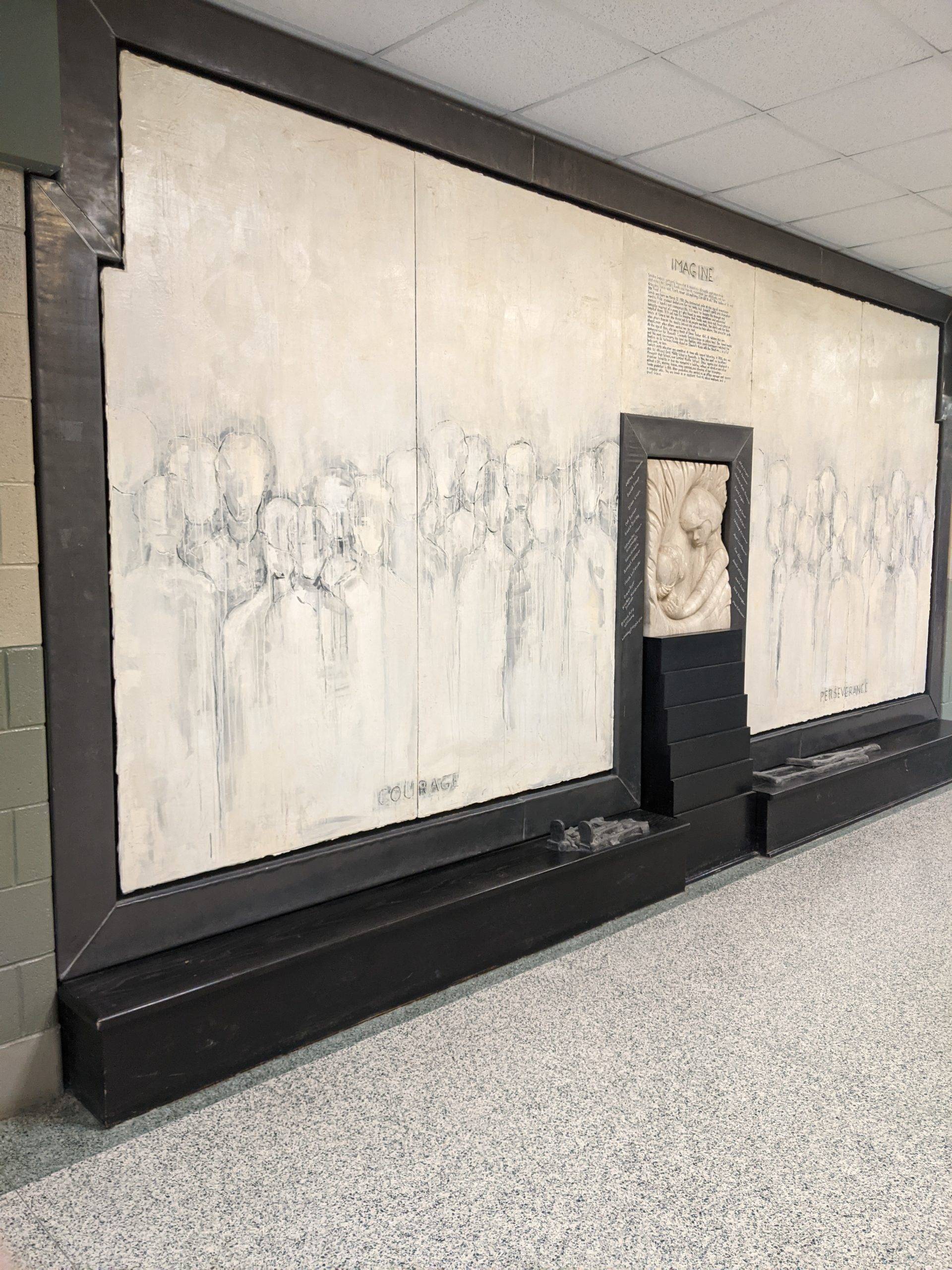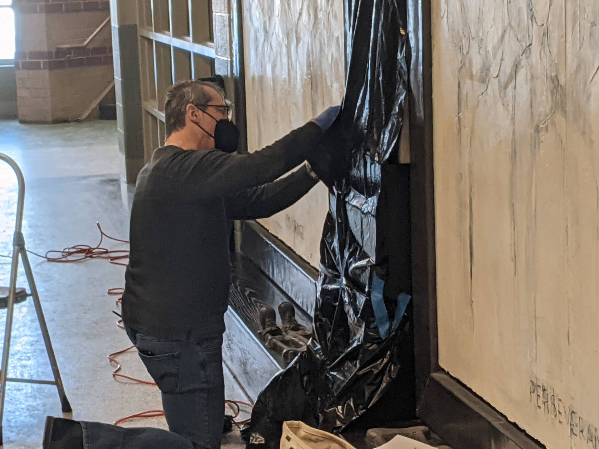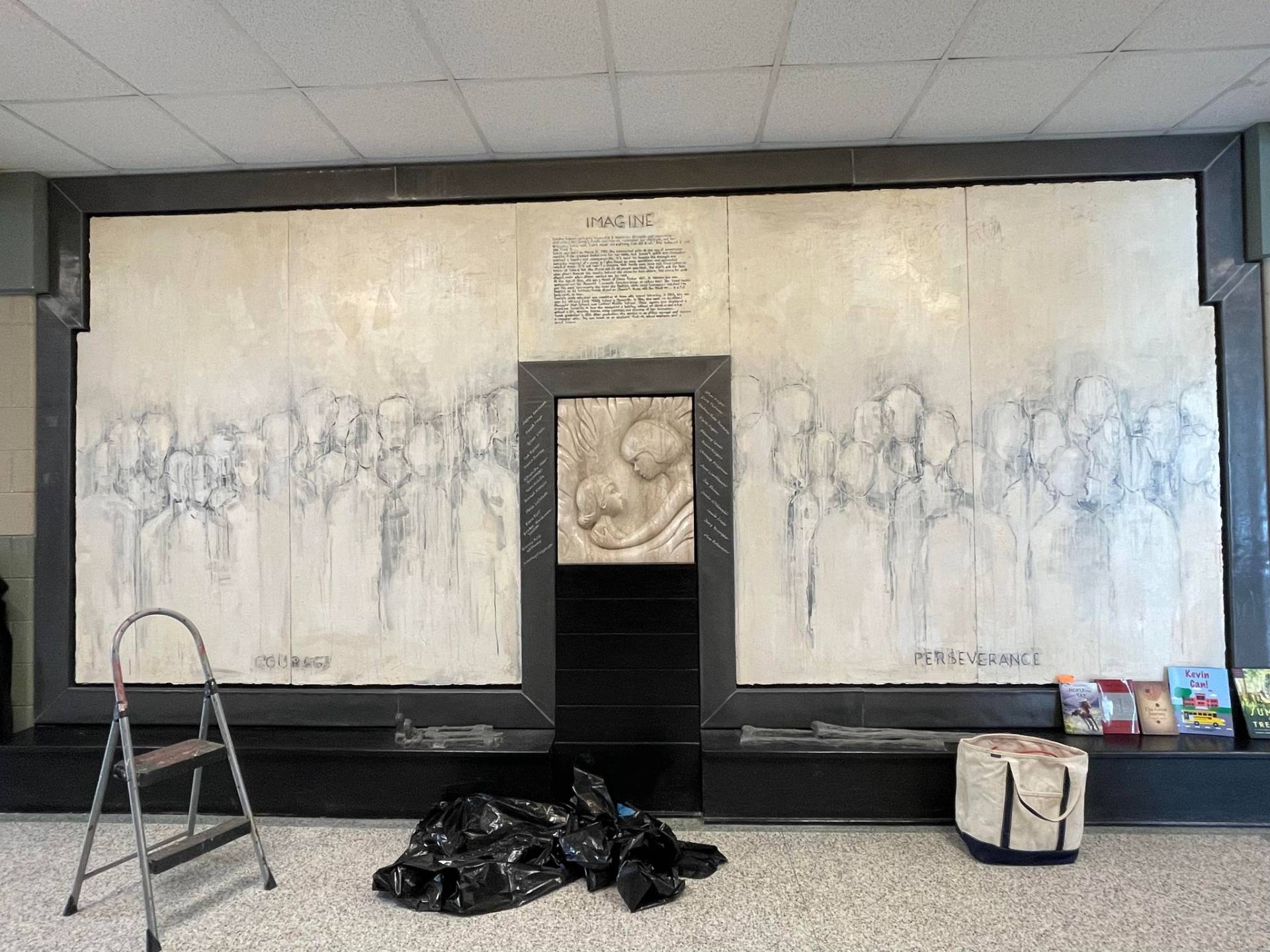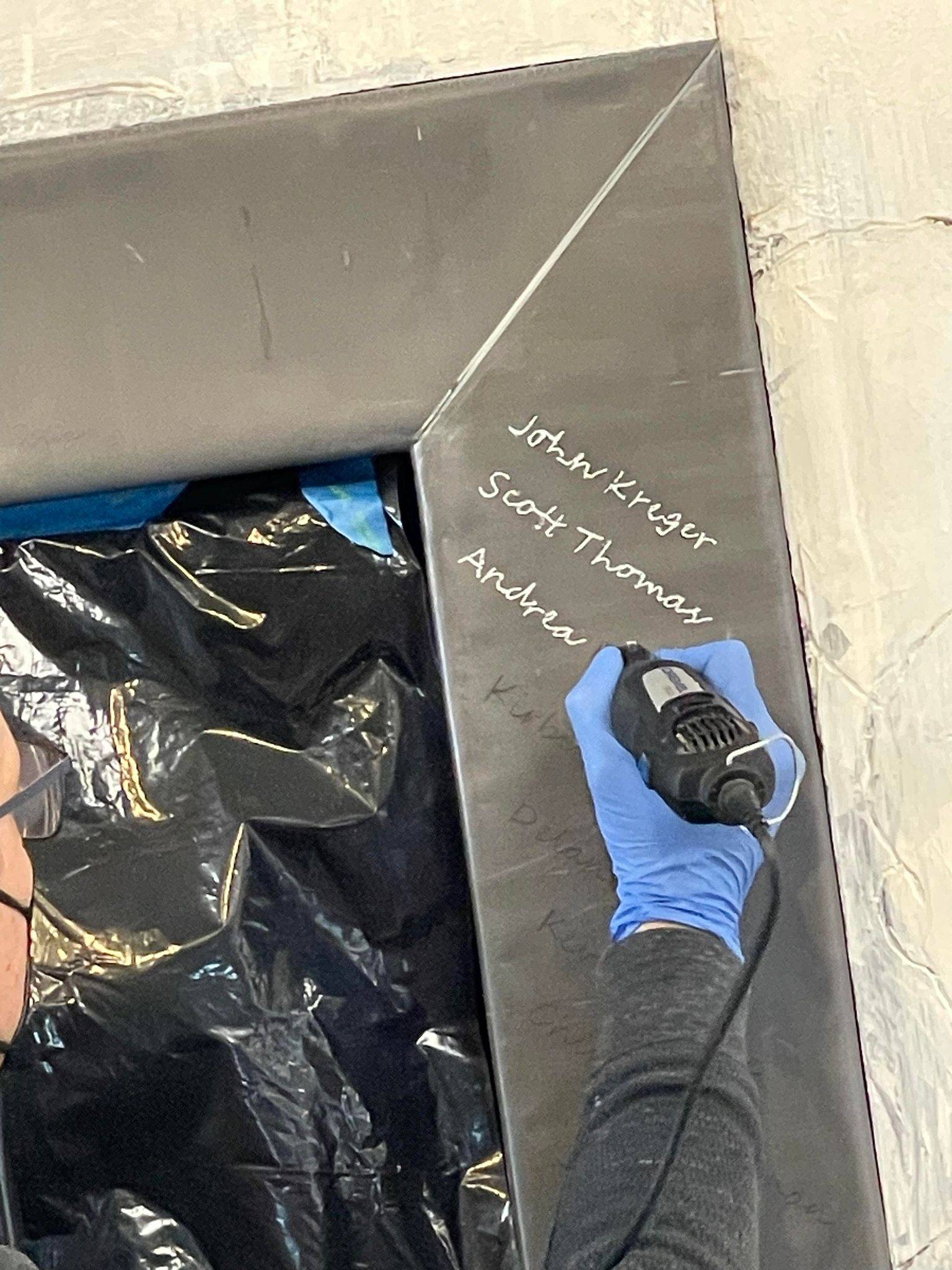 “Here I am this past Saturday engraving 26 names into an installation I designed and completed 23 years ago. The twenty six individuals are past and present students that succeeded in their education while facing some form of adversity. The Sandra Sagear Wall was installed in the new Plymouth High School before its opening in 2001. More photos to follow, but here is my statement about the installation: The image that moved me so regarding Sandra Sagear’s life was picturing her as a small child strapped with leg braces and crutches. I imagined her constant struggle. Struggles that any healthy person would avoid or take for granted. Being a parent, I imagined the hardship her family must have endured.” (Dennis Jones)