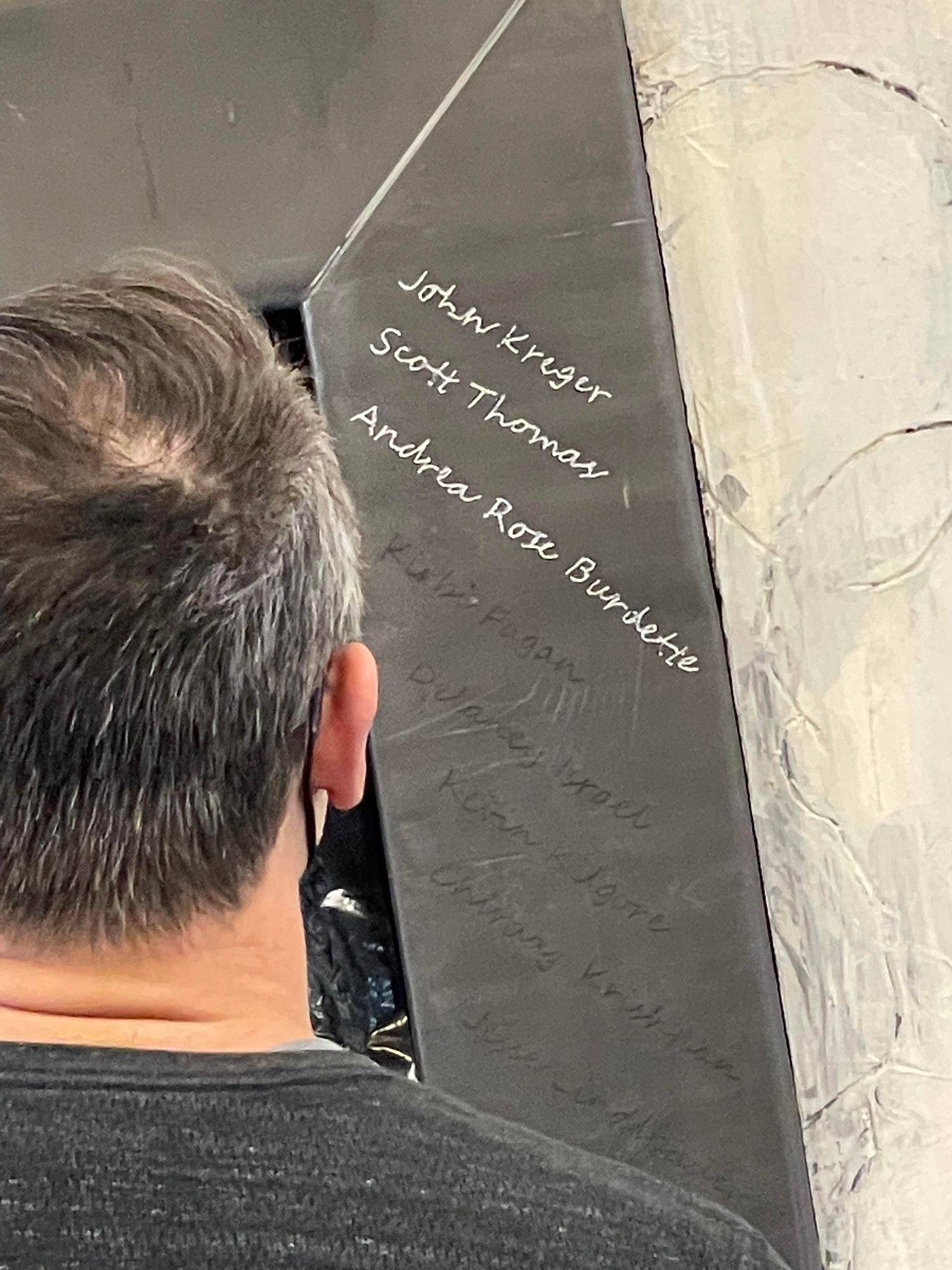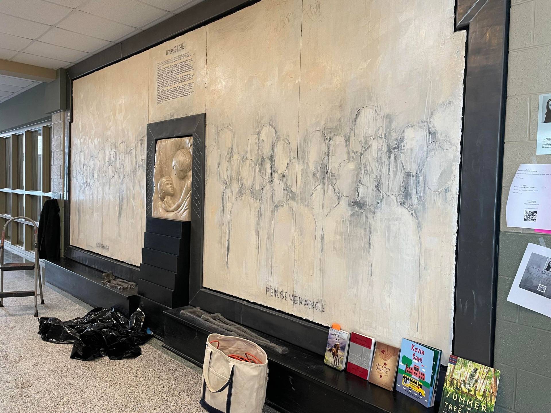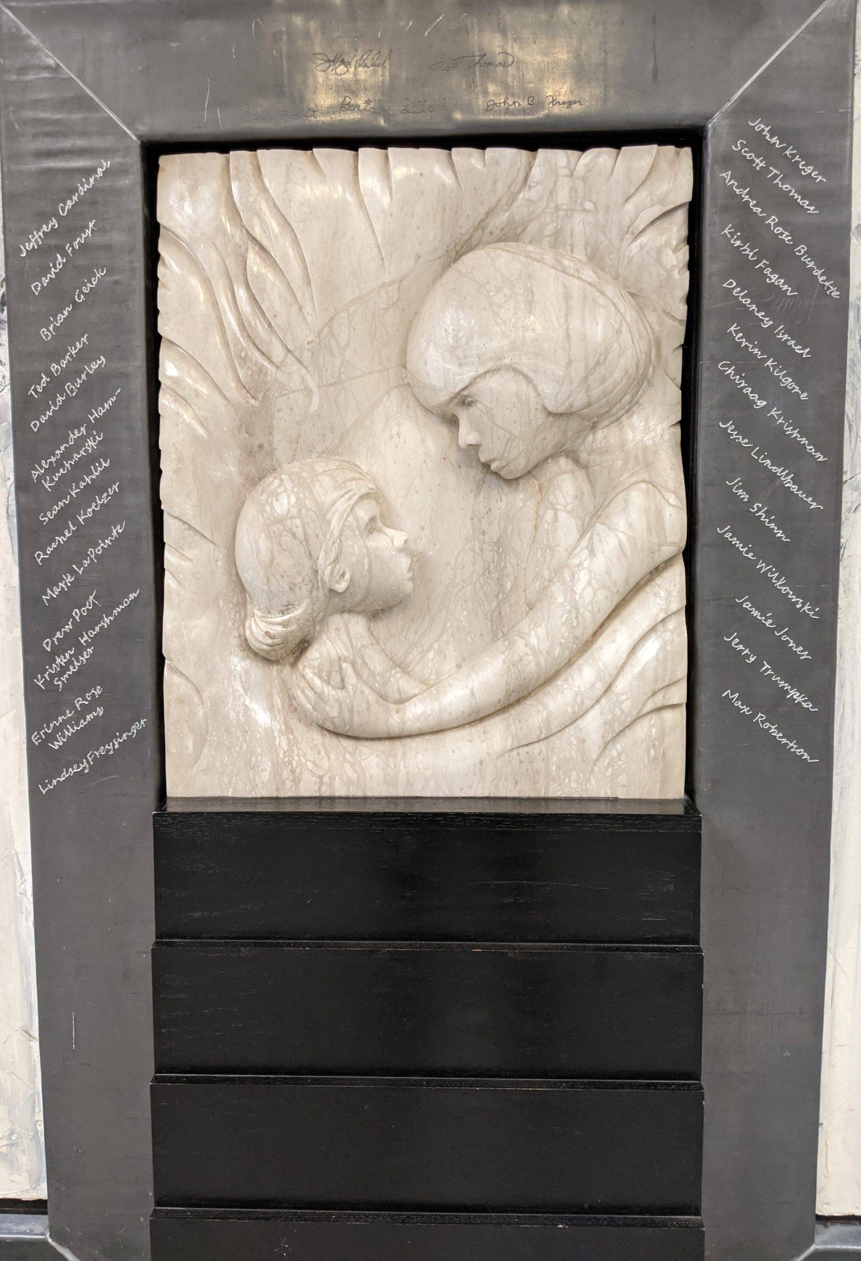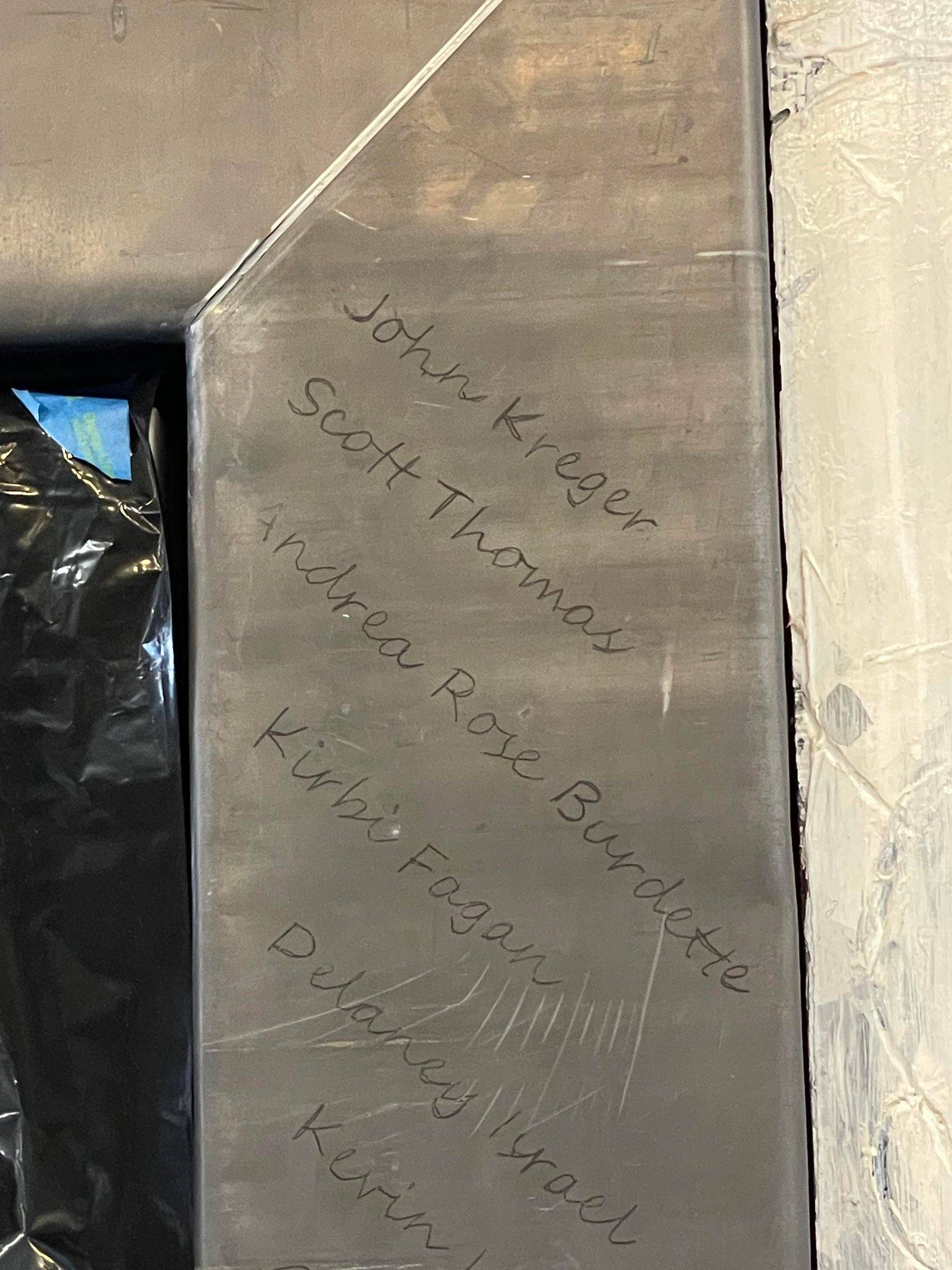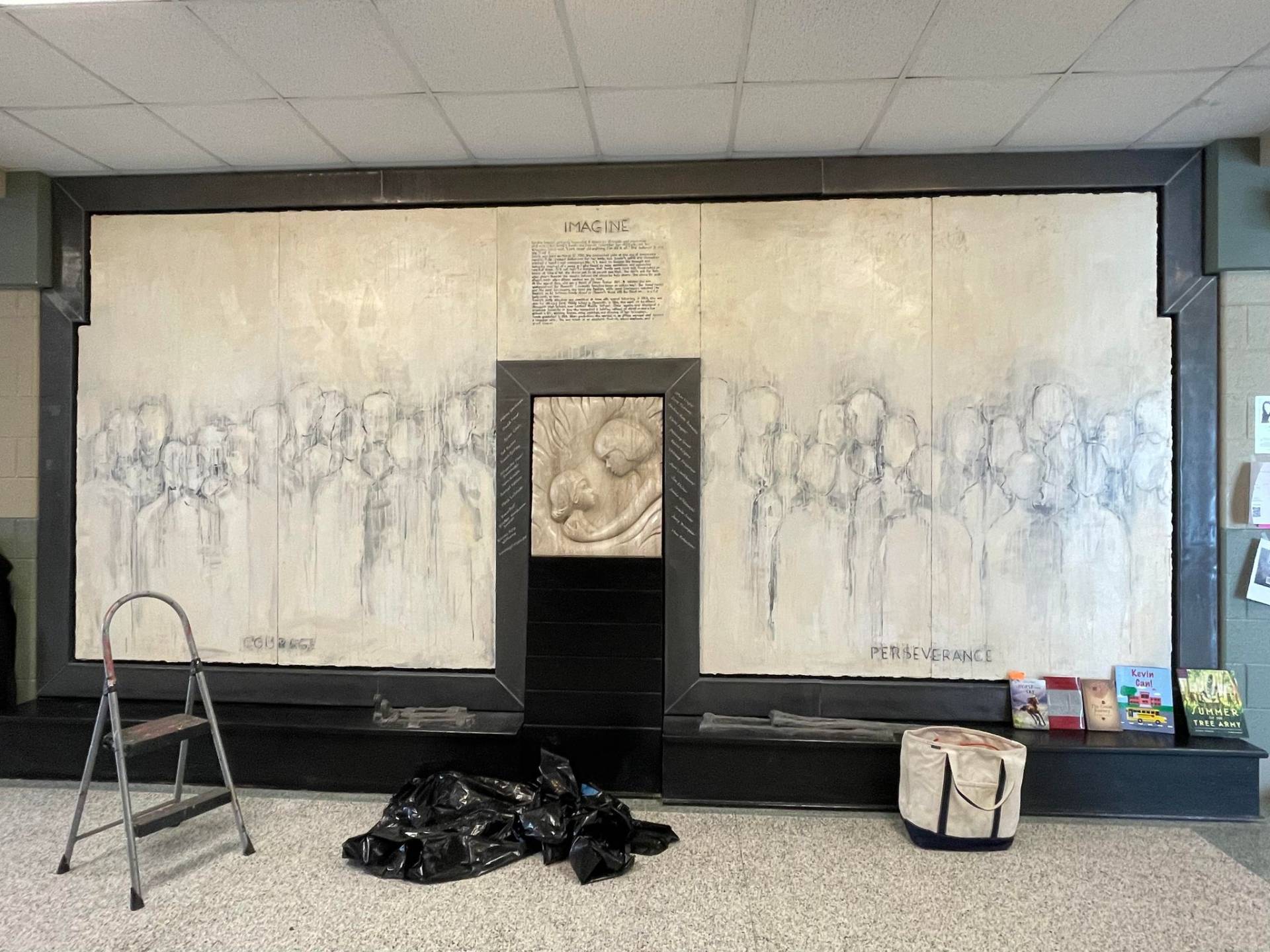 “Here I am this past Saturday engraving 26 names into an installation I designed and completed 23 years ago. The twenty six individuals are past and present students that succeeded in their education while facing some form of adversity. The Sandra Sagear Wall was installed in the new Plymouth High School before its opening in 2001. More photos to follow, but here is my statement about the installation: The image that moved me so regarding Sandra Sagear’s life was picturing her as a small child strapped with leg braces and crutches. I imagined her constant struggle. Struggles that any healthy person would avoid or take for granted. Being a parent, I imagined the hardship her family must have endured.” (Dennis Jones)
