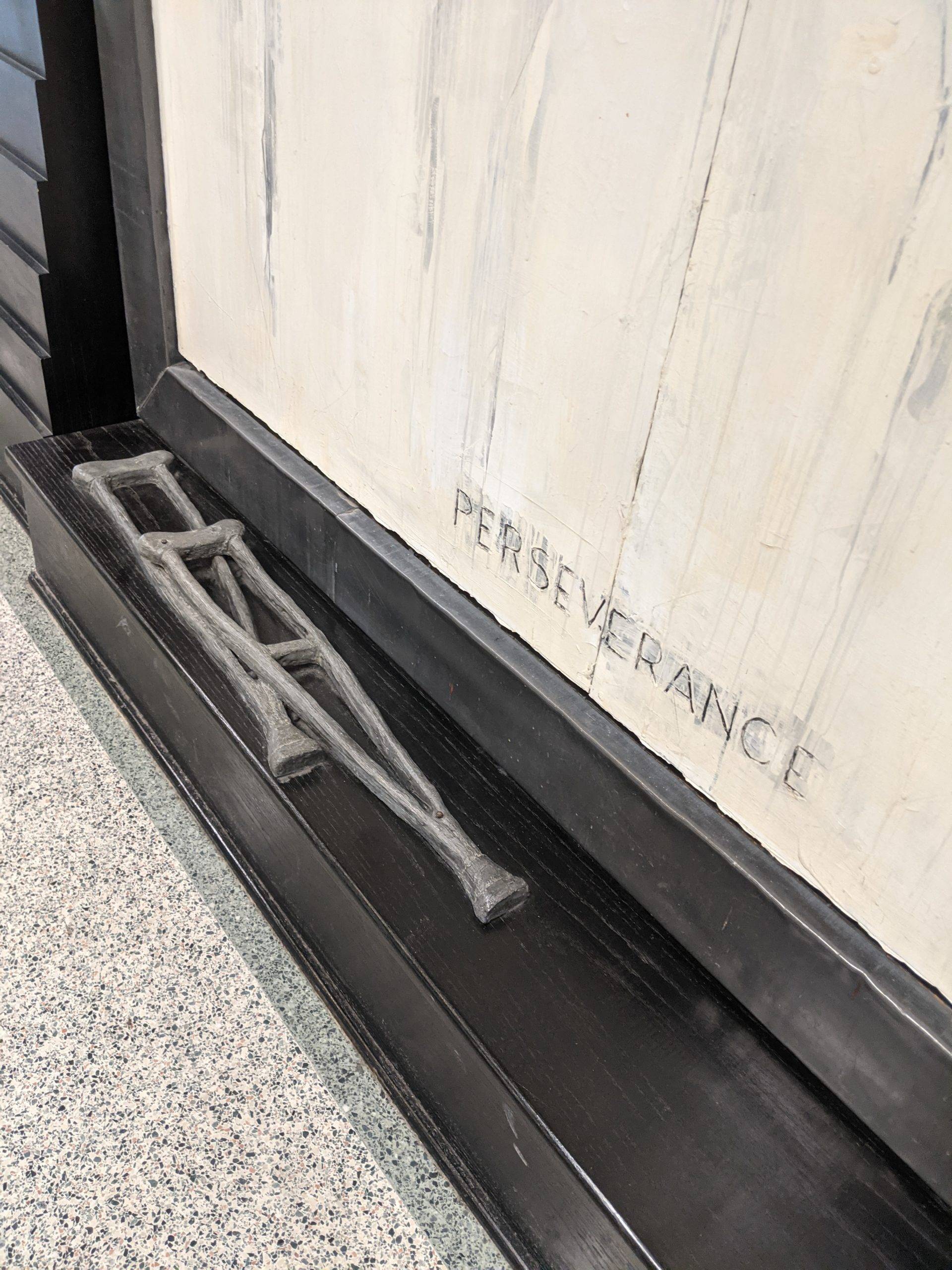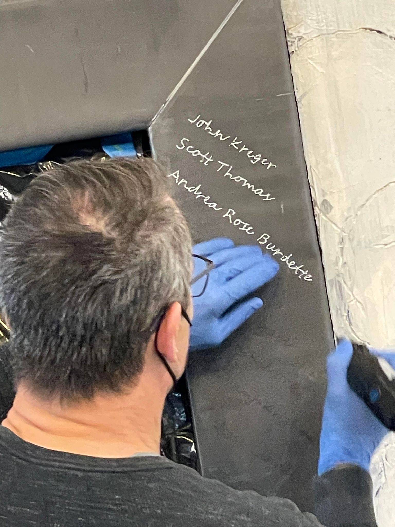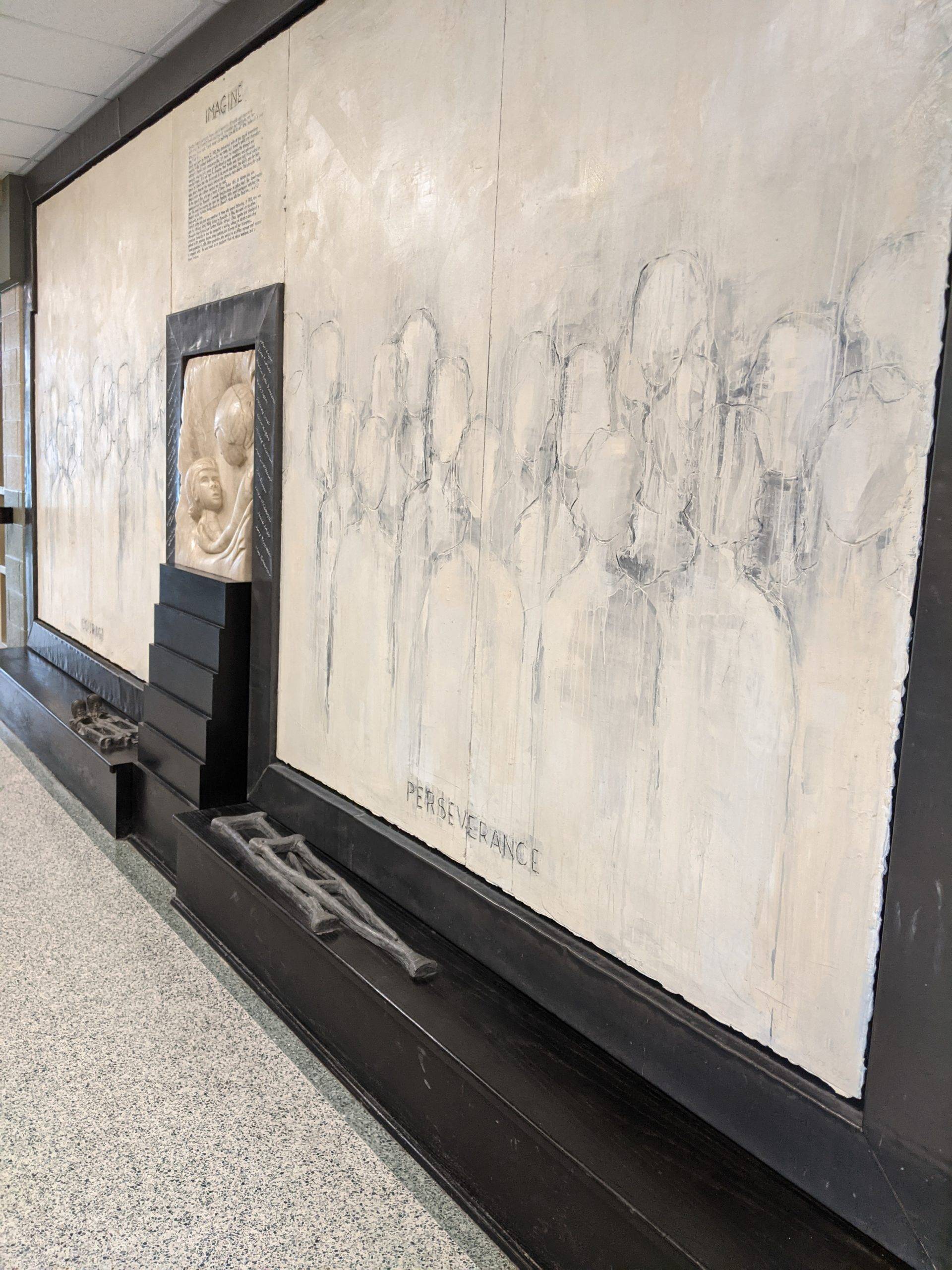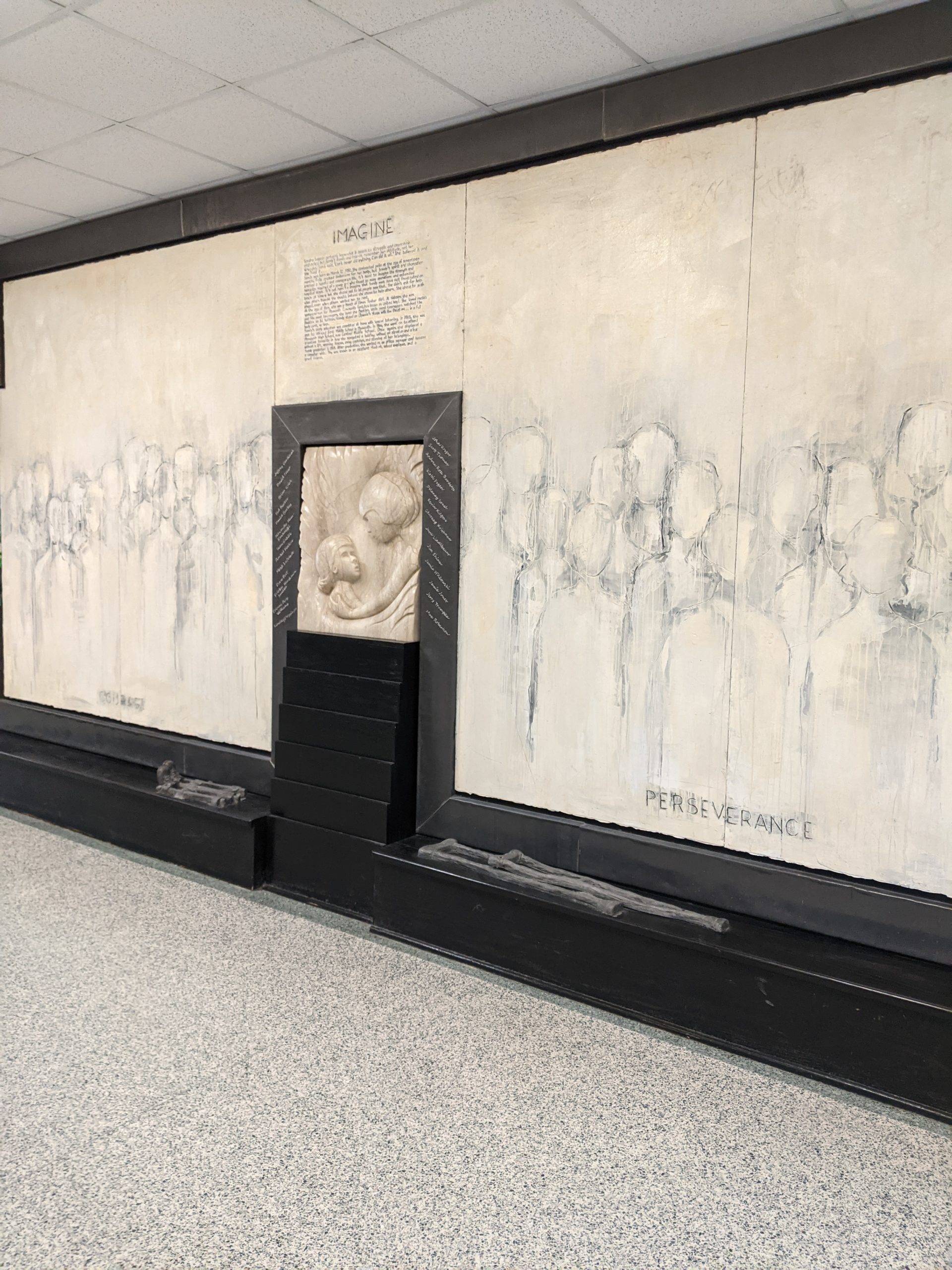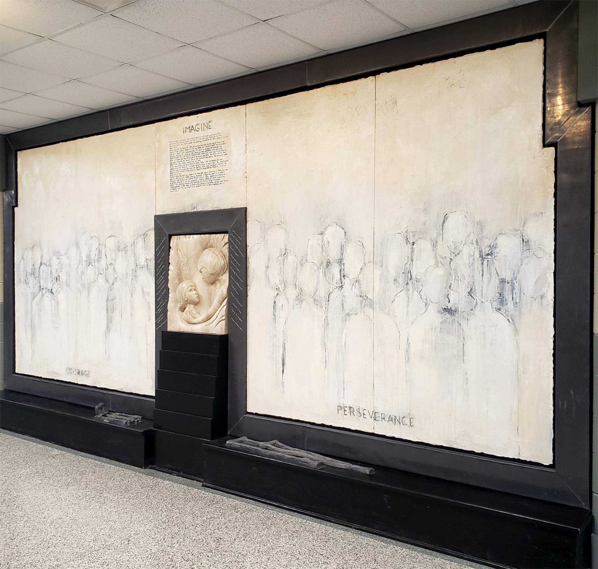 “Here I am this past Saturday engraving 26 names into an installation I designed and completed 23 years ago. The twenty six individuals are past and present students that succeeded in their education while facing some form of adversity. The Sandra Sagear Wall was installed in the new Plymouth High School before its opening in 2001. More photos to follow, but here is my statement about the installation: The image that moved me so regarding Sandra Sagear’s life was picturing her as a small child strapped with leg braces and crutches. I imagined her constant struggle. Struggles that any healthy person would avoid or take for granted. Being a parent, I imagined the hardship her family must have endured.” (Dennis Jones)