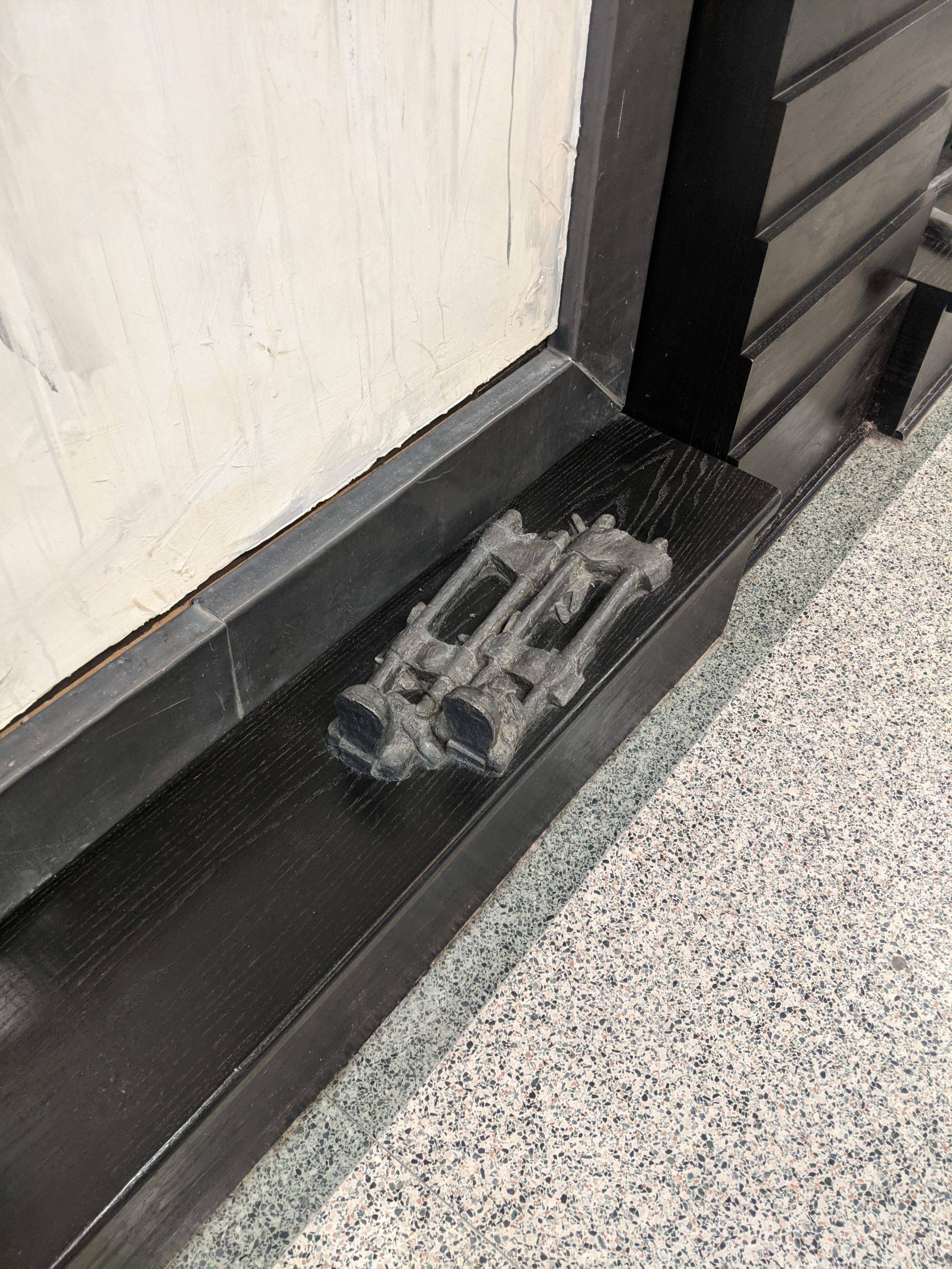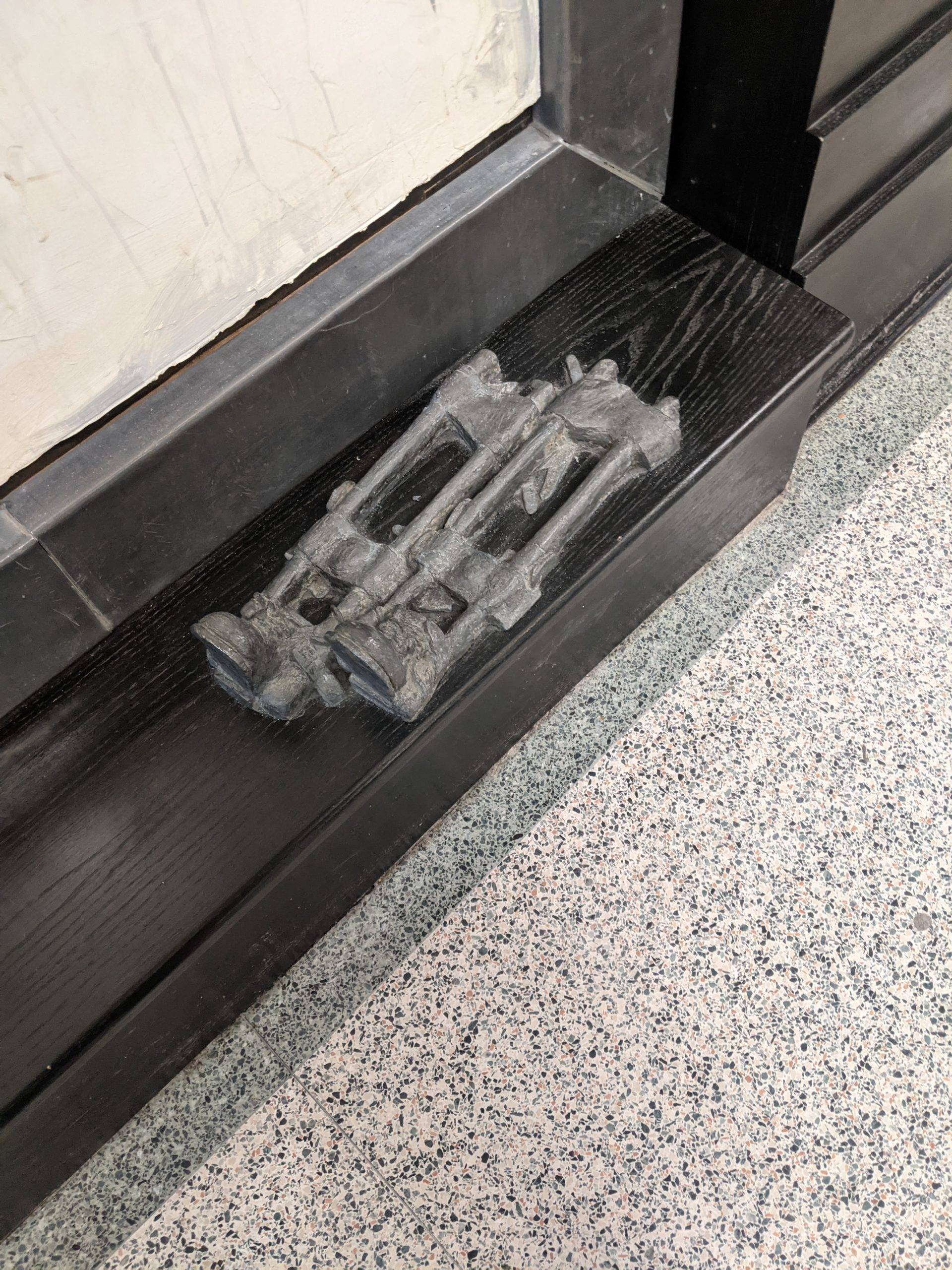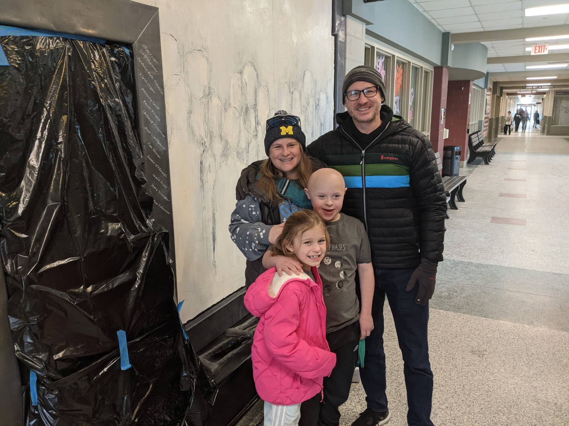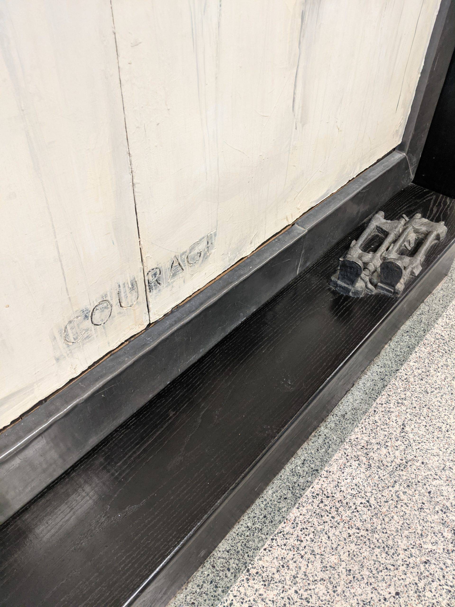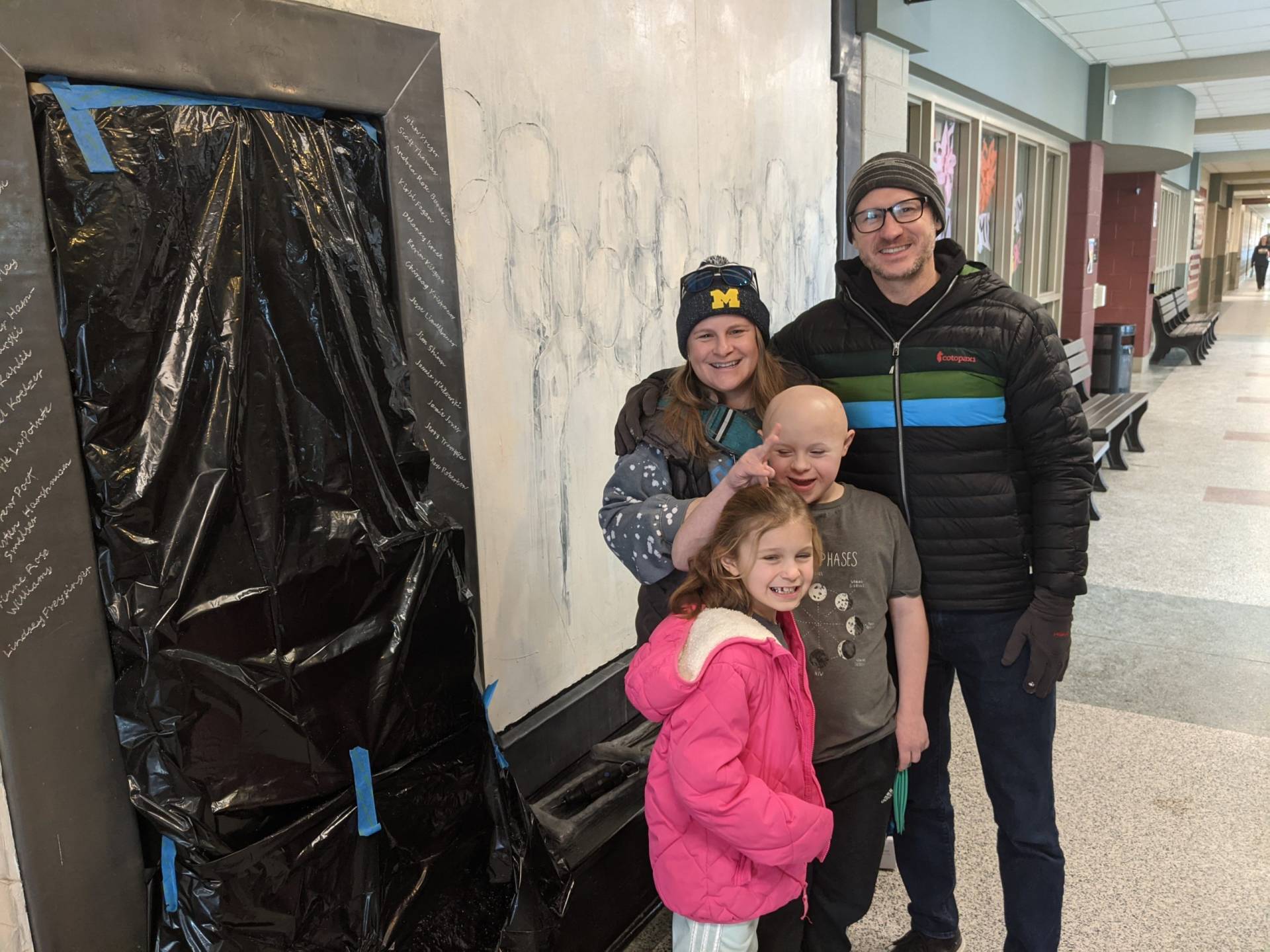 “Here I am this past Saturday engraving 26 names into an installation I designed and completed 23 years ago. The twenty six individuals are past and present students that succeeded in their education while facing some form of adversity. The Sandra Sagear Wall was installed in the new Plymouth High School before its opening in 2001. More photos to follow, but here is my statement about the installation: The image that moved me so regarding Sandra Sagear’s life was picturing her as a small child strapped with leg braces and crutches. I imagined her constant struggle. Struggles that any healthy person would avoid or take for granted. Being a parent, I imagined the hardship her family must have endured.” (Dennis Jones)